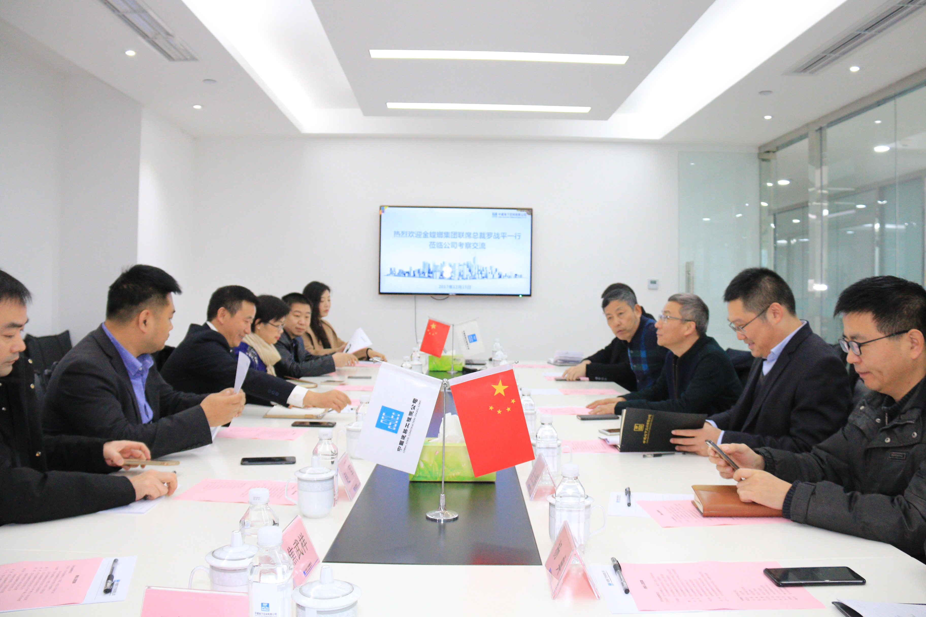 12月15日,国内建筑装饰第一品牌金螳螂集团联席总裁罗战平一行赴我司考察交流,总经理薛国州率公司领导班子、相关部门负责人会见考察团一行。 座谈会上,公司总经理薛国州对金螳螂集团罗总裁一行的到来表示热烈的欢迎,对金螳螂集团在建筑装饰领域的领先地位予以了肯定,他指出,“金螳螂”作为国内首家上市的装饰公司,完善的产业链条、荣获近百项鲁班奖令人尊敬,期待双方优势互补、资源共享,开展业务合作,共绘发展蓝图。罗总裁一行在听取了我司创新业务板块的介绍后,对公司管廊智慧运维、城市智慧停车等业务表现出浓厚兴趣,对我司创新人才的储备培养工作给予高度评价,他表示,中建地下空间公司是以“技术领先、专业领军、创新领航”的科技型公司,是“金螳螂”一直寻求的优质合作伙伴,金螳螂集团愿意积极与中建地下空间公司开展全方位的深度合作。 会上,双方正式签署战略合作协议,下一步将在PPP项目领域发挥各自优势,凝心聚力,合作共赢,抢占发展先机。
