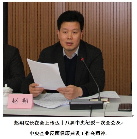 院总经理、党委副书记赵翔传达了全国“两会”、十八届中央纪委三次全会及中央企业反腐倡廉建设工作会的精神并要求全院党员领导干部务必高度重视,深刻学习领会并贯彻落实中央和上级精神,提高自身对反腐倡廉工作的认识,自觉做好廉洁自律工作。副院长、党委委员白翔在会上传达了易军书记和刘杰组长在总公司反腐倡廉建设工作会上的讲话精神。
